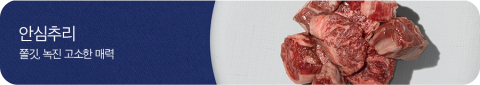 녹진 촉촉한 지방의 매력을 알고 계시는 분들께 적극 추천하는 안심추리는 근막의 쫄깃함, 적절히 살린 지방의 녹진한 맛이 살코기의 부드러운 식감과 어우러지는 일명 안심계의 특수부위입니다.