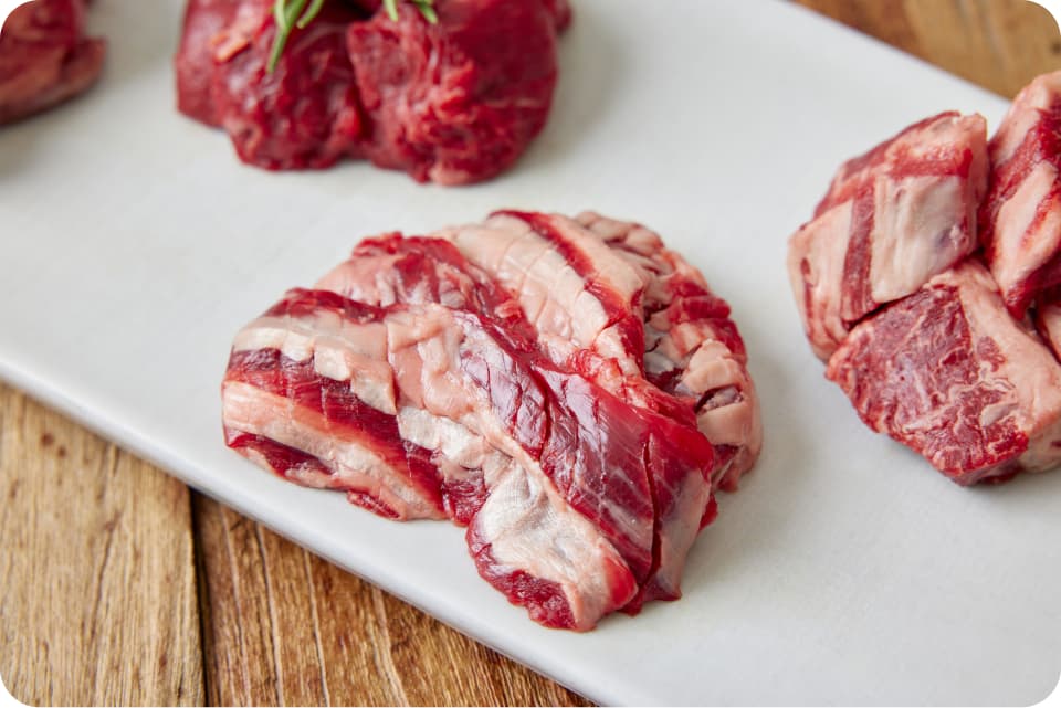 세 번째, 지방과 근막이 함께 붙어 있는 근육으로 마치 배때기와 같은 부위입니다. 티본에서 ‘ㅡ’ 모양에 붙어 있는 부위입니다. 어느 정도의 근막과 지방이 있어 쫄깃한 맛이 특징이기에 설로인에서는 쫀득 녹진한 맛이 매력적인 ‘안심 추리’ 제품을 만듭니다.