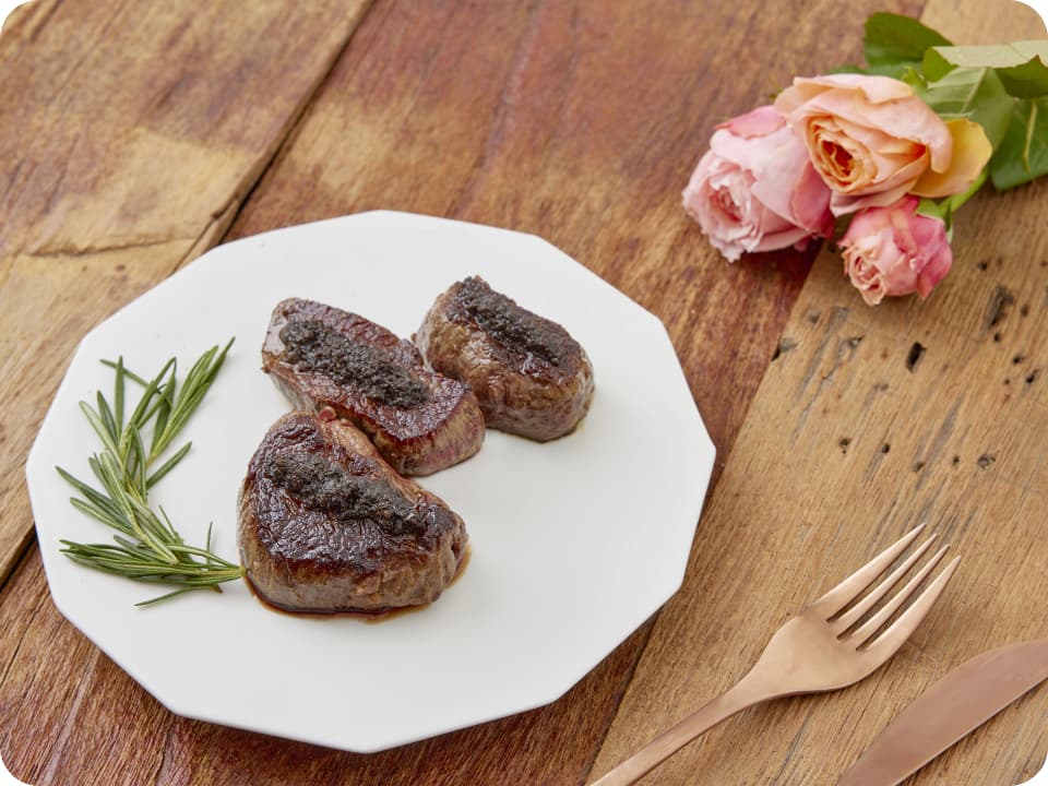 도톰한 두께가 매력이지만 그만큼 굽기 어려운 안심. 안심은 채끝이나 갈비와 같은 부위보다 근내 지방 (마블링)이 적어, 내부의 온도가 빠르게 올라갑니다. 미니샤토는 샤토브리앙과 같은 안심의 중앙 부분에 3cm 두께지만 보다 작은 세 조각으로 나눴어요. 스테이크 초보자더라도 속까지 골고루 촉촉하게 구울 수 있죠.