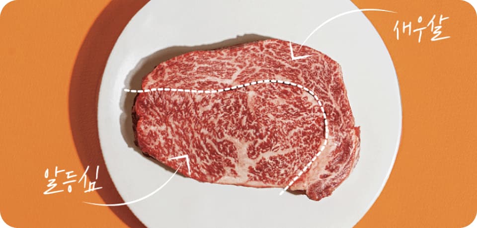 알등심과 새우살의 완벽한 만남, 설로인 꽃등심. 촘촘한 마블링, 적절한 육향, 부드러운 식감 모두 출중한 알등심에, 한우의 에이스 새우살이 합쳐진 부위 꽃등심입니다. 설로인 꽃등심은 덧살, 떡심, 근간지방을 섬세히 손질하고 알등심과 새우살만을 남겼을 뿐만 아니라 새우살의 비중을 일정 이상 확보했습니다.